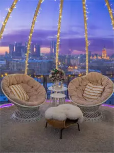 Видовой обзор 360 градусов. Вид на центр Москвы. Бинокль, романтический интерьер площадки, кресло-кокон для двоих, панорамный домик с отоплением и кондиционированием. Защита от непогоды - 100%.